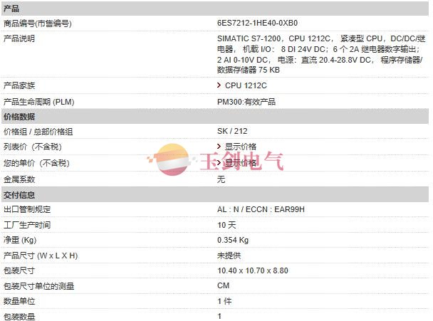 SIMATIC S7-1200 PLC模块,CPU 1212C, 紧凑型 CPU,DC/DC/继电器, 机载 I/O: 8 DI 24V DC;6 个 2A 继电器数字输出; 2 AI 0-10V DC, 电源:直流 20.4-28.8V DC, 程序存储器/数据存储器 75 KB
