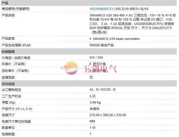 SINAMICS V20 变频器 380-480 V AC 三相交流 - 15/+ 10 % 47-6 标称功率 15 kW 有 60 秒 150 % 过载 未过滤 I/O 接口:4 DI,2 DO, 2 AI,1 AA 现场总线:USS/MODBUS RTU 安装有 BOP 防护等级 IP20/UL 开放 尺寸: 尺寸 D 240x207x173(宽x高x深)
