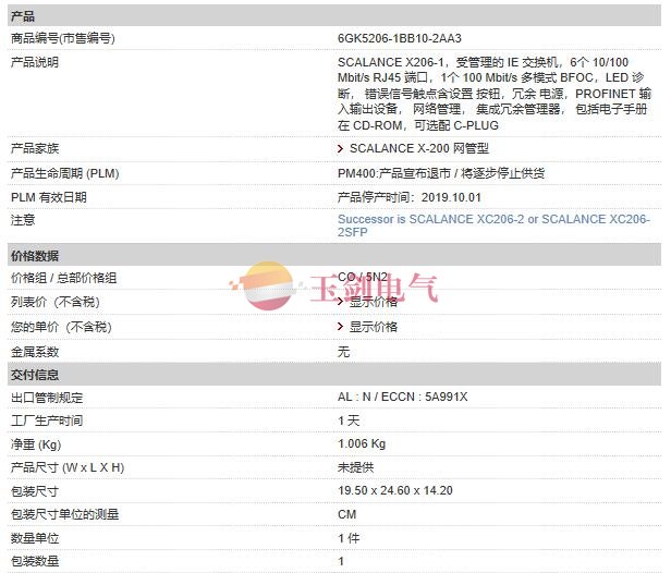 SCALANCE X206-1,受管理的 IE 交换机,6个 10/100 Mbit/s RJ45 端口,1个 100 Mbit/s 多模式 BFOC,LED 诊断, 错误信号触点含设置 按钮,冗余 电源,PROFINET 输入输出设备, 网络管理, 集成冗余管理器, 包括电子手册在 CD-ROM,可选配 C-PLUG